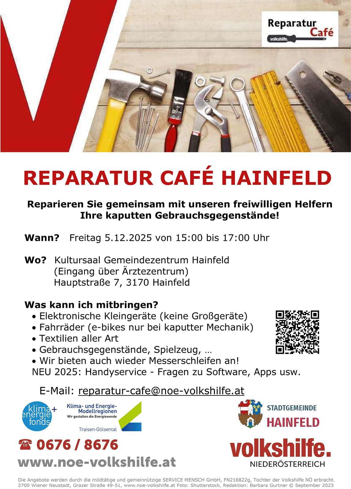 Reparieren Sie gemeinsam mit unseren Freiwilligen Ihre kaputten Gebrauchsgegenstände! Wann? Freitag 05.12.2025 von 15 bis 17:00 Uhr Wo? Kultursaal Gemeindezentrum Hainfeld (Eingang über Ärztezentrum) [...]